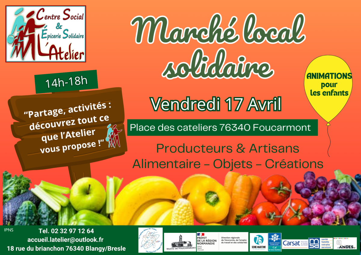 MARCHE LOCAL SOLIDAIRE – Vendredi 17 Avril 2026 Mar 27, 2026 | Actualités Le marché local solidaire aura lieu le Vendredi 17 Avril 2026, de 14h à 18h, Place des Cateliers 76340 FOUCARMONT.